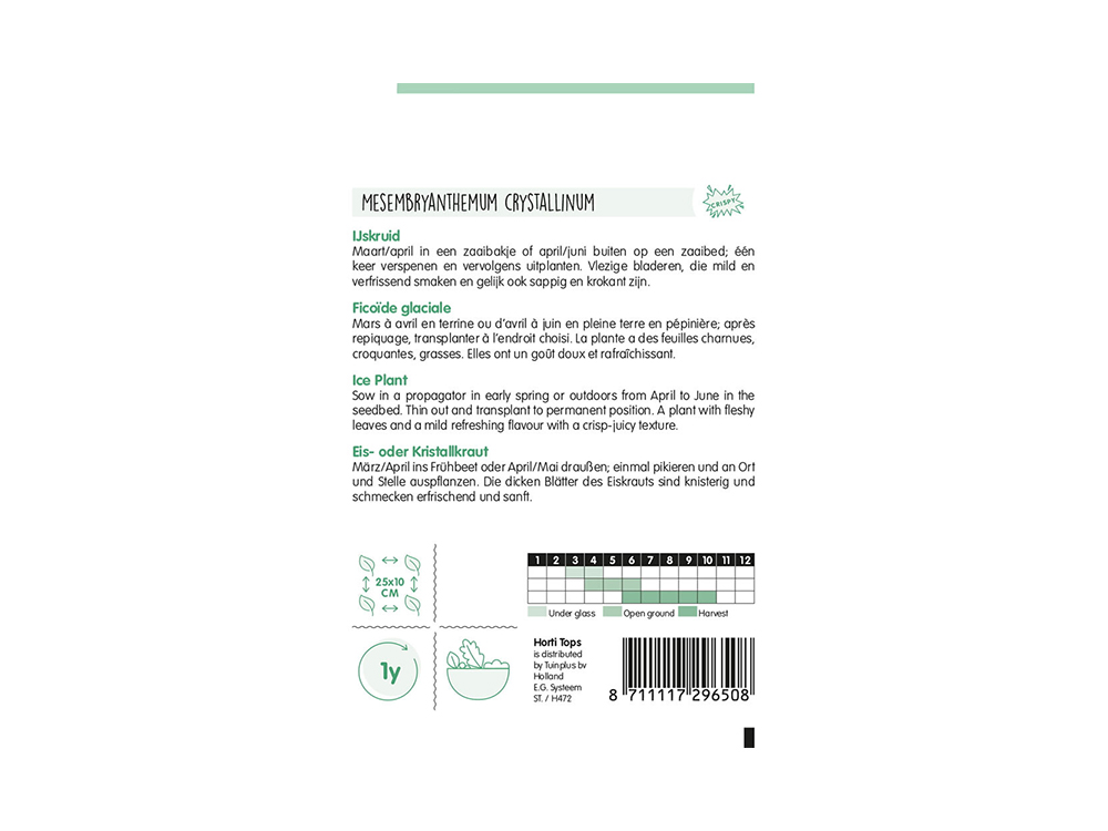 Zaai ijskruid vanaf maart/april in een zaaibakje of vanaf april/juni buiten op een zaaibed. Eén keer verspenen en vervolgens uitplanten.
