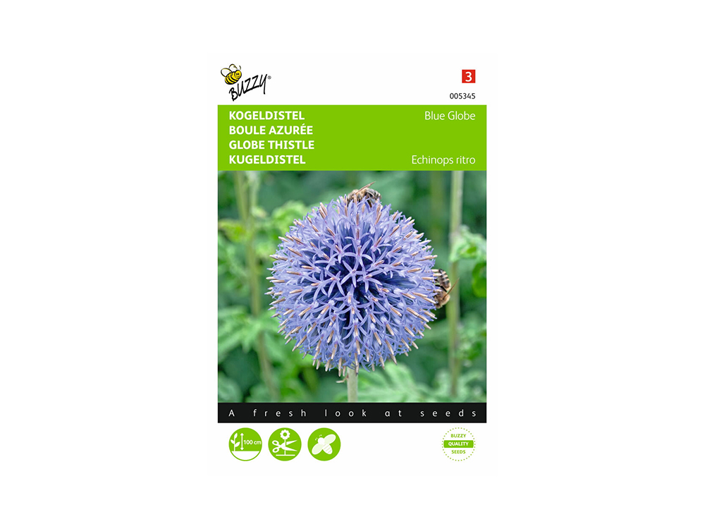 Deze kogeldistel Blue Globe met zijn violetblauwe kogelvormige bloemen is heel opvallend en geeft een exotisch kleur- en vormeffect in de border. Als de bloemen gesneden worden voordat de bloempjes uit de bolletjes komen, kunnen ze ook gedroogd worden. De plant houdt van een goed waterdoorlatende grond waar best wat kalk in mag zitten. De bloemen trekken ook bijen aan.