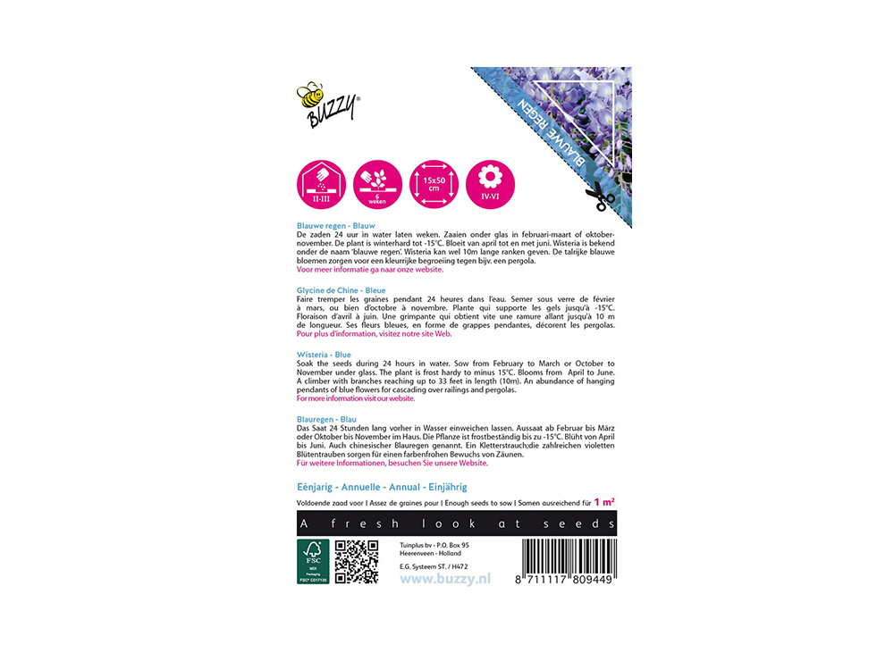 Blauwe regen Blue is bekend onder de naam Wisteria sinensis. De klimplant kan wel 10 meter lange ranken geven. De talrijke blauwe bloemen zorgen voor een kleurrijke begroeiing tegen bijvoorbeeld een pergola.