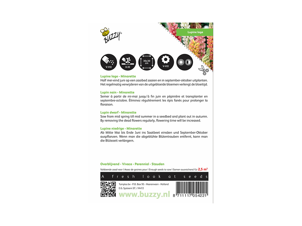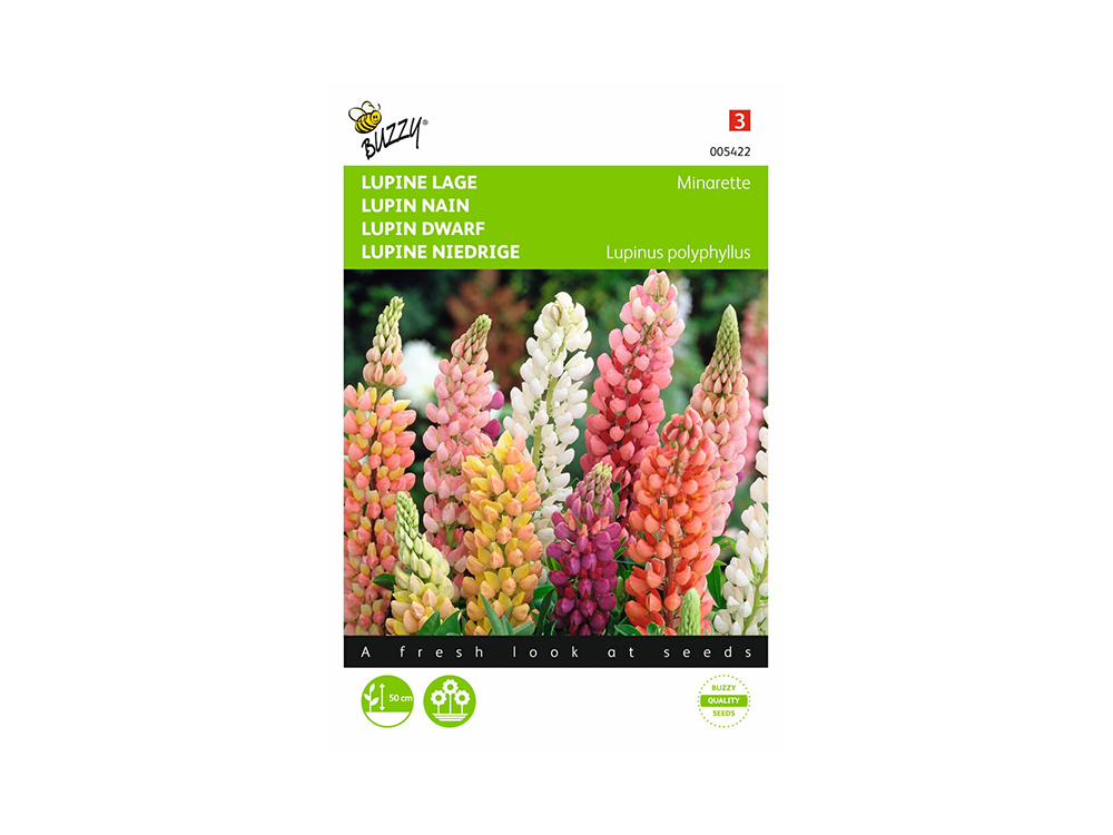 De meerjarige Lage Lupine Minarette bloeit in de meest fantastische pasteltinten. De bloemen blijven laag tot 50 cm, dus ideaal om in de border toe te passen. Kies een zonnige standplaats.