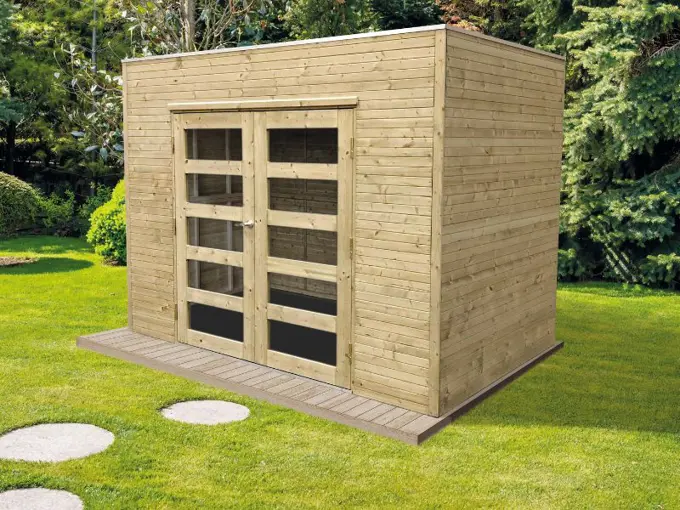 Creëer een moderne, functionele tuinberging met een plat dak dat strak oogt en praktisch gebruiksgemak biedt voor opslag en buitenwerk.