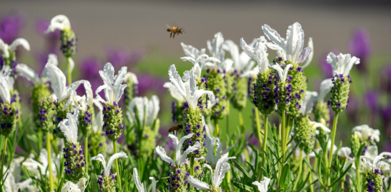 Lavendel hoeft allang niet meer alleen blauw-paars te zijn. Er bestaan ook witte en roze varianten. Voor een frisse, lichte border is Lavandula angustifolia ‘Alba’ indrukwekkend, terwijl de dwergsoort ‘Nana Alba’ met sneeuwwitte bloemen ideaal is voor kleinere tuinen. Roze accenten haal je in huis met bijvoorbeeld ‘Miss Katherine’ (tot 75 cm hoog), ‘Loddon Pink’ of de klassieke ‘Rosea’.