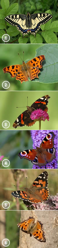 Op zes en zeven zetten we de vosjes: de grote vos (Nymphalis polychloros) en de kleine vos (Aglais urticae). Twee mooie hoofdzakelijk oranje vlinders van een verschillend formaat en patroon en nog enkele belangrijke essentiële verschillen. De kleine vos houdt van brandnetels als waardplant en kan tot drie generaties per jaar voortbrengen. Terwijl de grote vos houdt van alleenstaande bomen zoals iep en wilg en slechts één generatie per jaar voortbrengt.