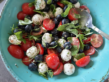 Spoel de kerstomaatjes en de blauwe bessen en doe ze samen in een kom. Meng er de mozzarellabolletjes onder, alsook de versnipperde zalm. Maak van de olie, citroen, look en kruiden een vinaigrette en giet het mengsel over de salade. Meng alles goed door elkaar. Laat even staan zodat alle smaken goed kunnen doordringen.