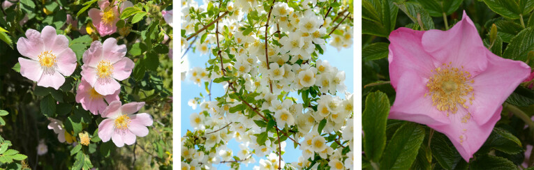 - Rosa canina of hondsroos, is een oude bekende. Tuinvogels zijn dol op de eivormige bottels, die ook in de keuken verrassend veelzijdig zijn. Deze roos is ideaal voor een gemengde haag en bloeit uitbundig in de vroege zomer met lichtroze bloemen. Hondsrozen worden ongeveer drie meter hoog en anderhalve meter breed.