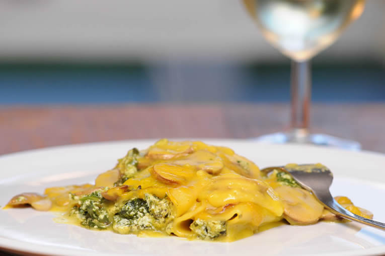 - Overgiet de cannelloni met de saffraansaus en plaats de schotel in de oven gedurende een 30 à 40 tal minuten.