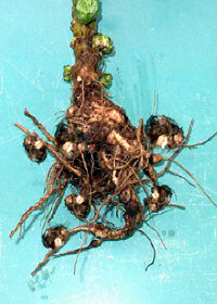 - aangetaste wortels van kolen zwellen op tot grote knollen (soms een sinaasappel dik) die in een later stadium rotten