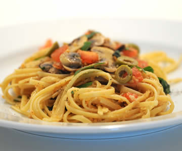 Proef van deze heerlijke pasta: linguine met amandelen en stukjes tomaat.