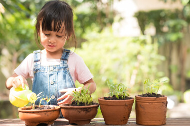 Je kan kinderen al op heel jonge leeftijd laten meehelpen, maar geef hen om te beginnen eenvoudige karweitjes zoals water geven met hun eigen gieter. Begeleid hen waar nodig en moedig het zelfstandig werken aan, dat maakt ze zelfzekerder. Vanaf een leeftijd van 7 jaar kan je dieper ingaan op het (moes)tuinieren en zullen ze ook beter begrijpen waar het om draait.