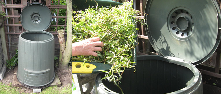 • Hierna kan het materiaal dat je wenst te composteren in het vat. Zorg voor een evenwicht van groen en bruin materiaal.