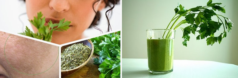 Peterselie is een bom van vitamine C. Het helpt tegen griep en verkoudheid en voor de huid is het een goede reiniger met een opwekkend effect. Onzuiverheden worden er door afgevoerd, het verbetert een gevlekte gezichtshuid en werkt verzachtend op kleine adertjes. Een masker op basis van peterselie is ideaal voor de vette huid: neem een handvol peterselie en spinazie en doe alles in een blender samen met wat kokend water. Meng het sap met wat fijngemalen havermout tot een papje. Voor de gevoelige huid kan je wat extra natuuryoghurt toevoegen. Breng het papje aan op het gezicht en wacht een 15 tal minuten. Spoel eerst af met lauw water, daarna met koud water.