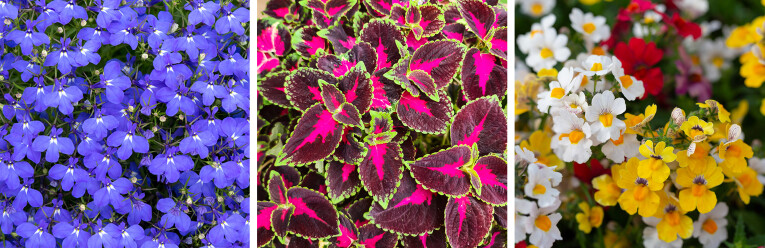 Geweldige keuzes zijn Ipomoea batatas (wat eigenlijk gewoon het blad is van zoete aardappel), en de opvallende, felgekleurde Solenostemon (syn. Coleus). Wees ook niet bang om er eens een grassoort tussen te zetten of een laagblijvende siermaïs, dat blaast leven in jouw bloembak. Vul grotere bloembakken met twee of meerdere soorten, zoals Nemesia in diverse kleuren met Pelargonium of Lobelia met siertabak. Of plant viooltjes samen met bonte klimop en Heuchera (purperklokje).