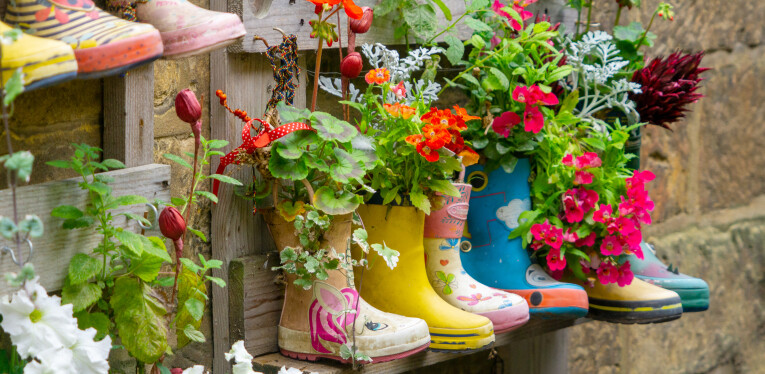 - Laat je creativiteit de vrije loop! Gebruik oude schoenen, laarzen, houten kisten, kruiwagens, vogelkooien, fietsen, reiskoffers, oude potten en pannen of meubels - alles is mogelijk! Maak van deze alledaagse voorwerpen jouw unieke DIY bloembakken.