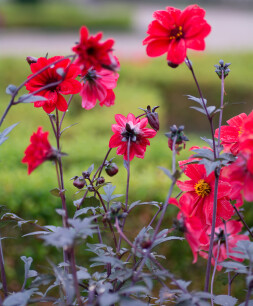 Dahlia’s uit de “Happy-single-serie” zijn allen vrolijk gekleurde dahlia’s met donker blad. De bloem is steeds enkel en is heel goed te combineren met planten die ook in die kleur bloeien zoals Penstemon “Garnet” of Salvia microphylla of juist met donkerder lila of paars. Denk aan paarse Phloxen, aan Thalictrum (ruit) of aan Amaranthus. De Happy-Singles worden zo’n 60 cm hoog, waardoor ze ook goed als kuipplant dienst kunnen doen.