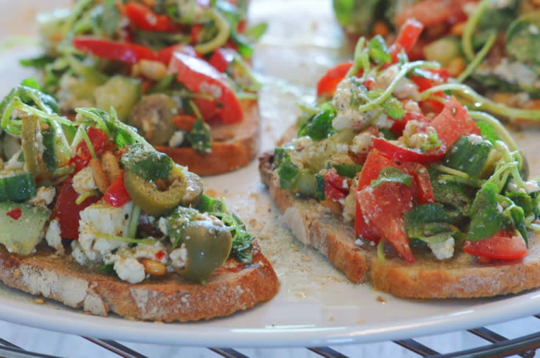 Dit is een eenvoudig recept met pure ingrediënten dat je doet denken aan het mooie Italië, Griekenland of Spanje. Je moet geen keukenprinses zijn om in een mum van tijd dit gerechtje op je bord te toveren waarbij al je zintuigen worden geprikkeld. De heerlijke geur van het warme broodje met olijfolie en de gebakken pijnboompitjes, een lekkere combinatie aan smaken en het mooi kleurenpalet geven ook onze ogen voldoening.