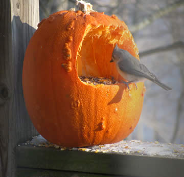Ook voor de vogeltjes in de tuin kunnen we iets leuks doen met een pompoen. De winter staat voor de deur en de tuinvogels hebben nood aan wat bijkomend voeder. Met een pompoen kan je zelf een leuk voederhuisje maken. Snijd een stuk uit de voorzijde van een grote pompoen en hol hem gedeeltelijk uit tot je een recht vlak hebt waar je zaden kunt opleggen.