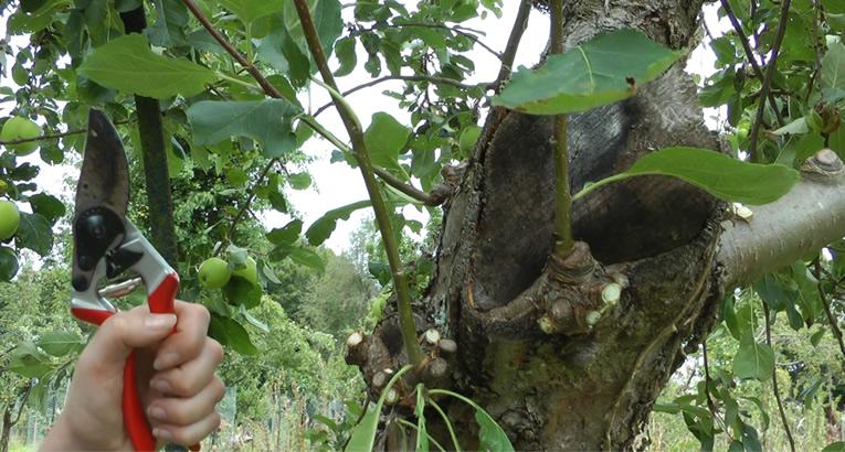 Kies een gezonde knop die de kant op wijst waar een scheut gewenst is. Vanaf de andere kant de stengel schuin afknippen oven het punt waar knop of scheut is aangezet – niet te schuin, want dan maakt u een grotere wond, die er langer over doet om te helen.