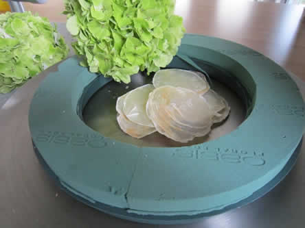 - Werk daar de Hydrangea tegenaan en werk zo verder de hele krans rond.