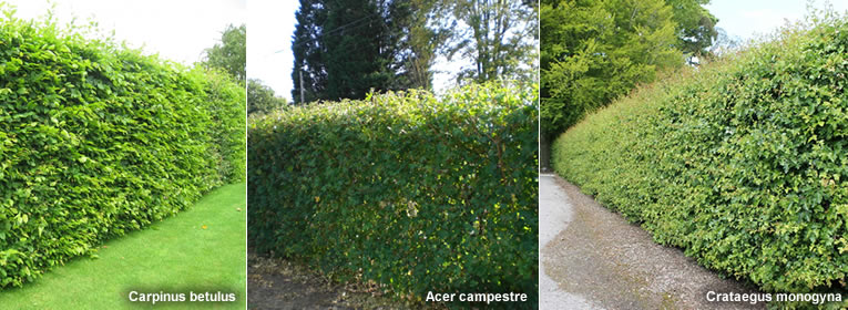 Bladverliezende soorten zoals meidoorn (Crataegus monogyna), veldesdoorn (Acer campestre), haagbeuk (Carpinus betulus) en beuk (Fagus sylvatica) zijn allen inheems en kleuren de tuin frisgroen in het voorjaar. Zowel haagbeuk en beuk behouden een deel van het verdorde herfstblad tot in de lente. Haagbeuk behoudt zo’n 30% en loopt opnieuw uit in maart terwijl beuk 60% van zijn verdorde blad behoudt maar pas groen kleurt in de meimaand. Meidoorn toont dan weer een opmerkelijke witte bloei in de vijfde maand van het jaar die later gevolgd wordt door rode bessen die geliefd zijn bij vele tuinvogels.