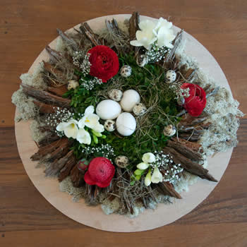 - Maak in het midden van de buxuskrans een bedje van zeegras en leg hierin een drietal kippeneieren. Werk het geheel verder af met nog wat zeegras en een aantal kwarteleieren.