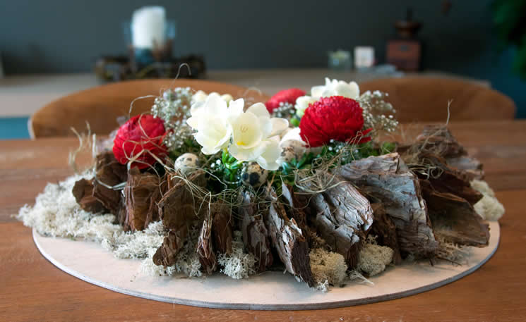 - Klem de 6 bloembuisjes tussen de schors en de buxuskrans. Vul deze met water en steek hierin een variatie van bloemen. Op de foto heb ik rode ranonkels, witte fresia’s en gypsophila gebruikt.