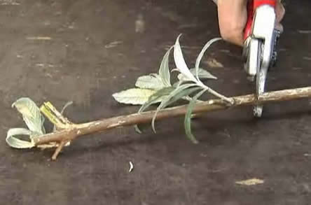 Begin met het afsnijden van enkele takken (liefst 's morgens), maar wees voorzichtig en snijd niet te diep. Het is belangrijk dat de moederplant de winter nog kan overleven. Als je een aantal takken hebt afgesneden, knip dan de zijtakken en bladeren weg tot ongeveer 3 à 4 cm vanaf de hoofdtak. Vervolgens verdeel je de takken in stekken van ongeveer 20 cm lengte. Snijd altijd ongeveer 1 cm onder een bladpaar en zorg ervoor dat de stek aan de bovenkant minstens 2 bladknoppen heeft.