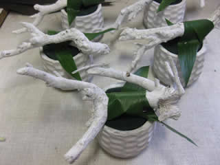 - Doordat we deze pookdraad niet meer willen zien gaan we deze wegsteken met een half Aspidistrablad. Snij het blad langs de nerf in 2. Schuif het blad onder de tak, ga rond de tak en schuif terug onder de tak. Zet vast met strokrammetjes.