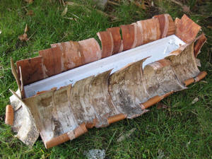• Knip of scheur ongeveer gelijke schorsrepen en speld deze op de isolatieplaat. Zorg dat je een rechtopstaande rand hebt van een aantal centimeter.