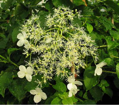 Tegen een muur op de noordkant en op een schaduwrijke plek geldt Hydrangea anomala subsp. Petiolaris, klimhortensia, als een ideale versierder. Hij kan flink groeien maar is goed in toom te houden. Aan oudere takken vormen zich hechtwortels. Jonge planten moeten worden aangebonden. De takken zijn bros en breekbaar als de wind er vat op krijgt. In juni en juli verschijnen witte bloemschermen met grote, steriele randbloemen. Goed winterhard.