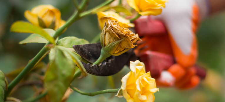 - Zoek op de rozenstruik de sterke en gezonde uitgebloeide scheuten uit, die ontstaan zijn uit de voorjaarssnoei.