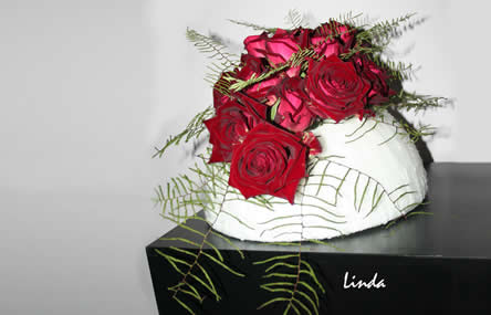 • Snij de rozen goed schuin aan, waar de druppelpunt van de bol zit laat je de stengel van de rozen iets langer, de rest wordt gelijkmatig mee gevuld met de vorm van de druppel.