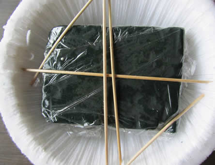 • Snij het steekschuim op maat, laat goed volzuigen met water en omwikkel de helft met huishoudfolie en tape deze vast.