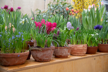 Bij bloembollen in pot is het belangrijk om ze niet te dicht tegen de rand te planten om vorstschade te voorkomen. De pot moet onderaan voorzien zijn van een opening zodat het overtollige water kan afgevoerd worden. Leg op de bodem wat scherven of een laag hydrokorrels voor een optimale drainage. Gebruik potgrond voor bloeiende planten omdat deze voldoende voeding bevat.