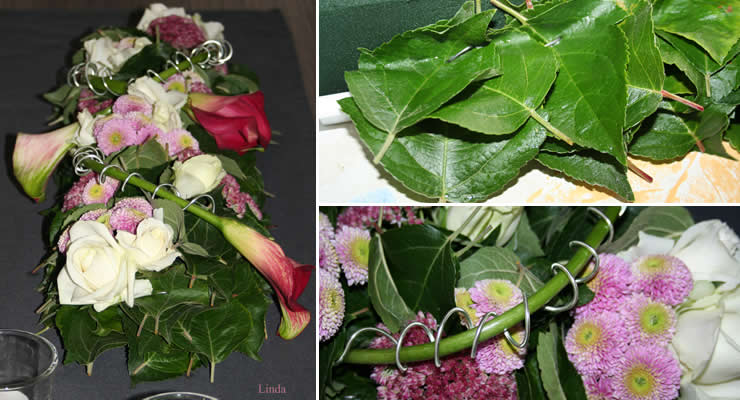 Bloemschikken blad en bloemen, zelf tafeldecoratie maken, decoratie voor tafel, bloemschikken met sedum, bloemschikken met calla's