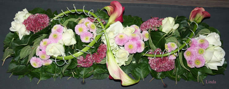 • Als finishing touch maak je rond de stengel van de calla’s een spiraal met de aluminiumdraad en steekt deze met een lichte boog over het geheel.