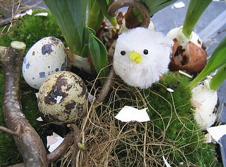 Deze schikking kan zeker ook gemaakt worden met andere lentebloembollen: krokussen, mini-paaslelies, blauwe druifjes,...Je kunt er ook een echte paasschikking van maken door gebruik te maken van: