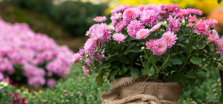 Chrysanten zijn de ideale potplanten die zich goed laten combineren met andere typische najaarssoorten. Plant roze, witte of gele chrysanten samen met bijvoorbeeld de roze tinten van Erica of het frisgroen van klimop. In combinatie met siergrassen zoals Carex geven ze jouw tuin een moderne look.
