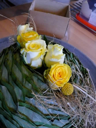 - Snij de Craspedia op maat en geef de bolletjes her en der een plaats tussen de rozen.