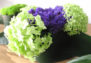 - Het 3e glaasje wordt opgemaakt met een beetje paarse Statice en Viburnum Opulus.
