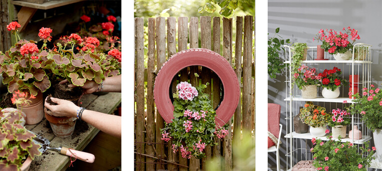 Heb je een klein balkonnetje of geen plek voor een grote bak op het terras? Ga dan verticaal tuinieren. Geraniums zijn prachtig in potten of manden aan de muur en een afgedankte stellingkast tover je zo om tot een fleurige ‘flat’ vol geraniums. Maximaal genieten op een minimale oppervlakte! Autobanden versleten? Geef ze een tweede leven als hangende ‘bloemband’ aan een muur of schutting. Een laag potgrond erin en planten maar. Liever geen zwarte band? Geef ‘m dan een likje verf!