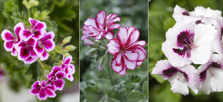 De ene geranium is de andere niet. De meest bekende soorten zijn de staande (Pelargonium zonale), de hangende (Pelargonium peltatum) en de Franse geranium (Pelargonium grandiflorum). Ze zorgen allemaal voor een rijke bloemenzee en met name de hangende soorten zijn prachtig in hanging baskets. De meest voorkomende kleuren zijn roze, wit, paars en rood. Maar laat je ook eens verrassen door nieuwe geraniums met tweekleurige bloemen: ton-sur-ton of met een contrasterend oog. Geraniums zijn tevens goed te combineren met andere zomerbloeiers als Petunia, Lobelia en Verbena.