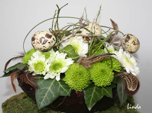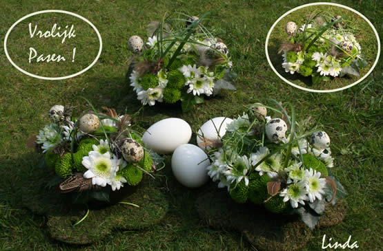 - Deze eieren vul ik al jaren elke keer opnieuw en dit jaar rusten ze op een bloemvorm met mos bekleed, (zo aangekocht in de winkel).