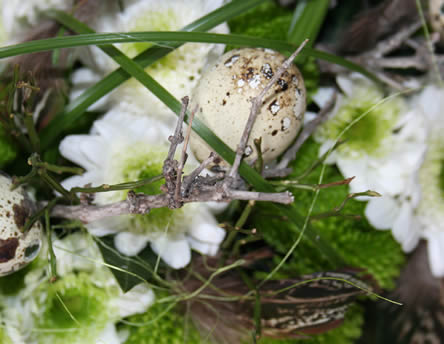 - Als afwerking worden enkele kwarteleitjes gekleeft op de gedroogde takjes en werk af met enkele veertjes.