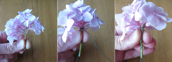 • Leg een corsagedraad of anjerdraad in het verlengde van je toefje. Hou de bloemen een beetje samen en wikkel net boven je duim de draad een 3 tal keer. Ga vervolgens met de draad onder je duim en wikkel zo naar beneden. Knip beide draadjes af. Die lopen nu evenwijdig met het steeltje van de Hortensia en zullen ervoor zorgen dat dit wel makkelijk in het steekschuim te verwerken is.