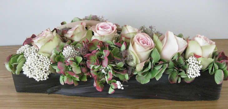 Een modern zelfgemaakt grafstukje met Hydrangea als grafstuk of als tafeldecoratie. Lees hier wat je nodig hebt en hoe je te werk gaat.