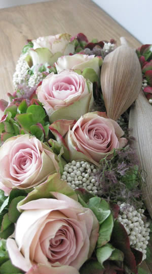 Andere materialen die je eventueel hierin kan verwerken is: witte sneeuwbes met bijvoorbeeld rode rozen. Tuinmaterialen:  Een rankje van de clematis, Sedum, Malus appeltjes, besjes, Viburnum bessen, Hypericum bessen, een mooie tak hierin verwerken, stukjes plataanschors….