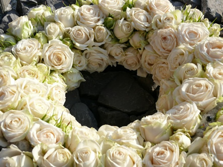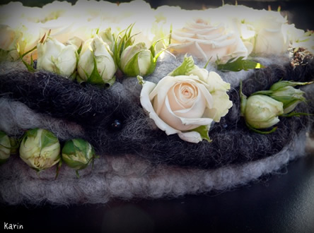 Hier een voorbeeld van een modern grafstuk met trosroosjes en wol op een krans ---> een cirkelvorm, symbool van oneindigheid, het niets of absolute vrijheid.
