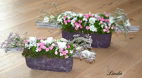 - vul nu het steekschuim verder met de dianthus en verwerk er hier en daar een lisianthus tussen