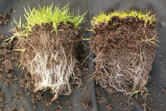 Link: gras geënt met Mycorrhiza, rechts zonder
