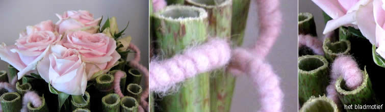 - Als kleurherhaling heb 3 pookdraden omwikkeld met gutta en er roze woldraad rond gelijmd.